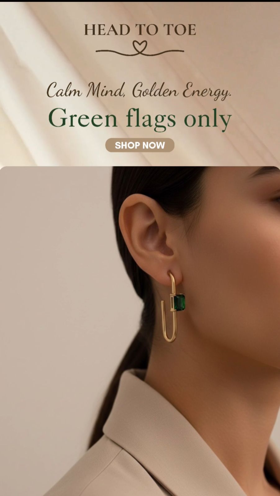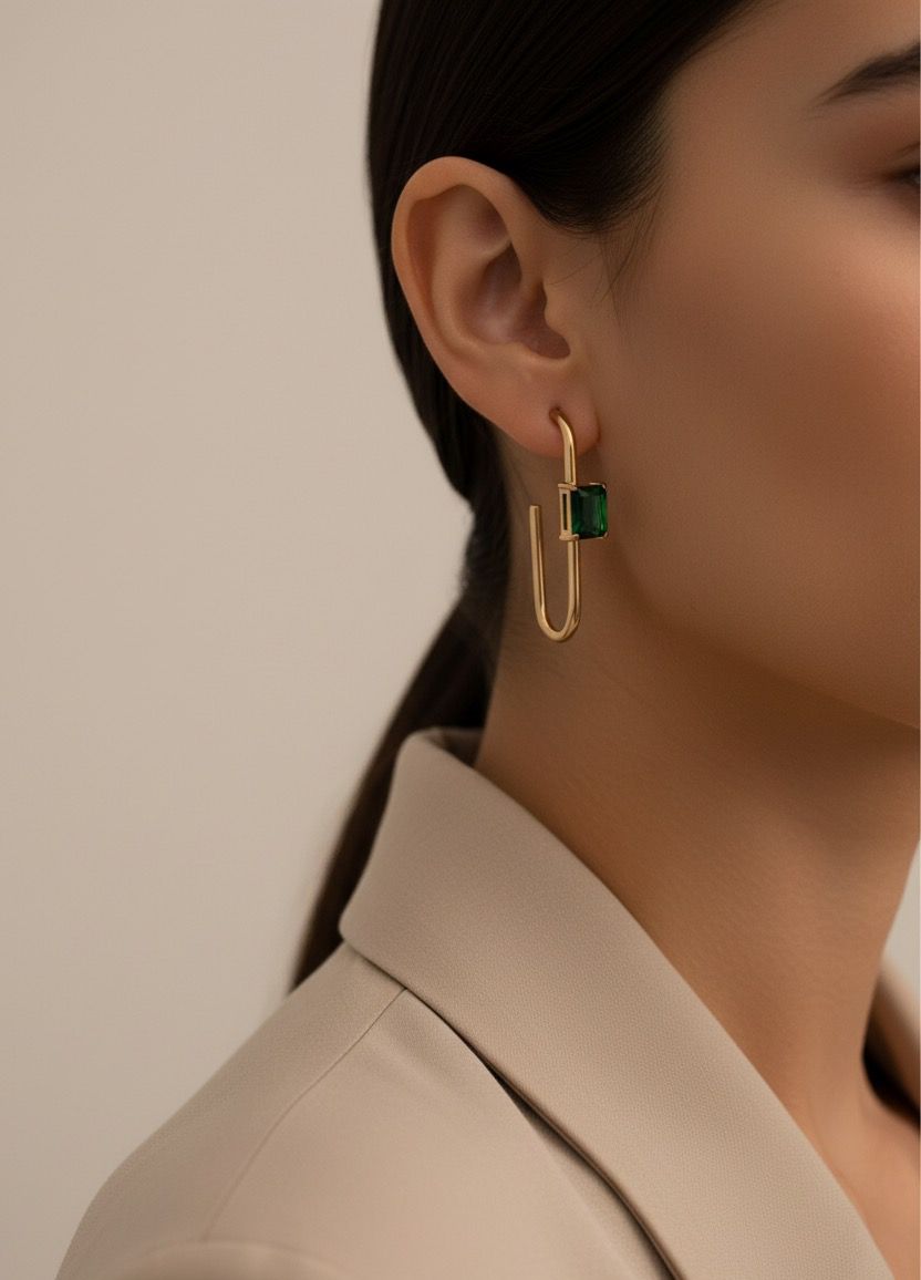 The CALMLINE Earrings bring together minimal geometry and tranquil energy. Crafted in a sleek gold-tone finish with a striking emerald-green stone, these earrings symbolize balance and positive flow. Lightweight yet bold, they add a refined touch to any modern look. Perfect for work, parties, or mindful moments — a reminder that calm is your true statement piece