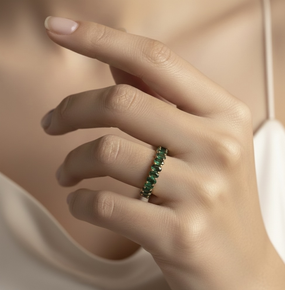 A gold band lined with rich green stones inspired by nature’s calm, lush elegance.
