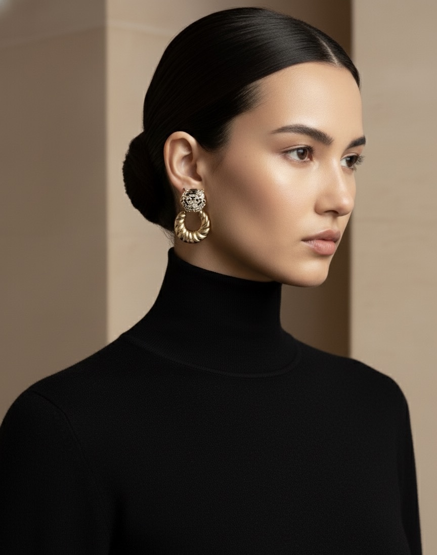Bold yet minimal gold hoops with a crystal-detailed tiger top.