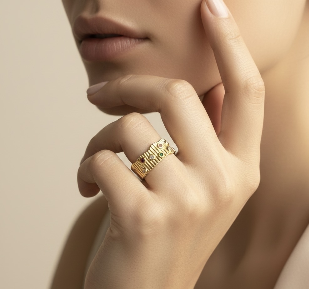 A textured gold band dotted with multicolour stones, created to bring a soft, cosmic sparkle to everyday looks.