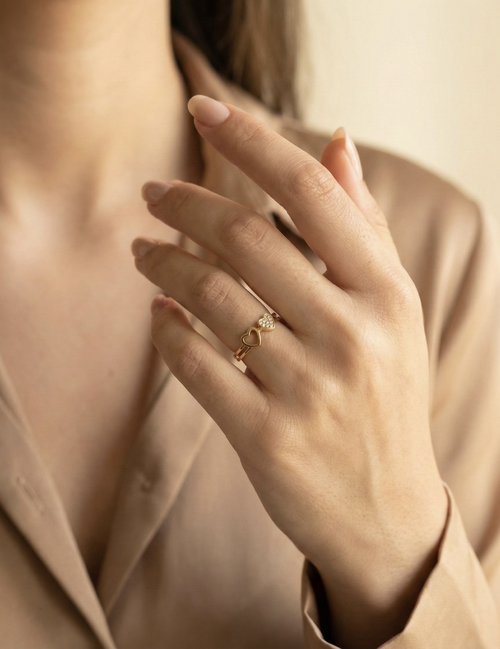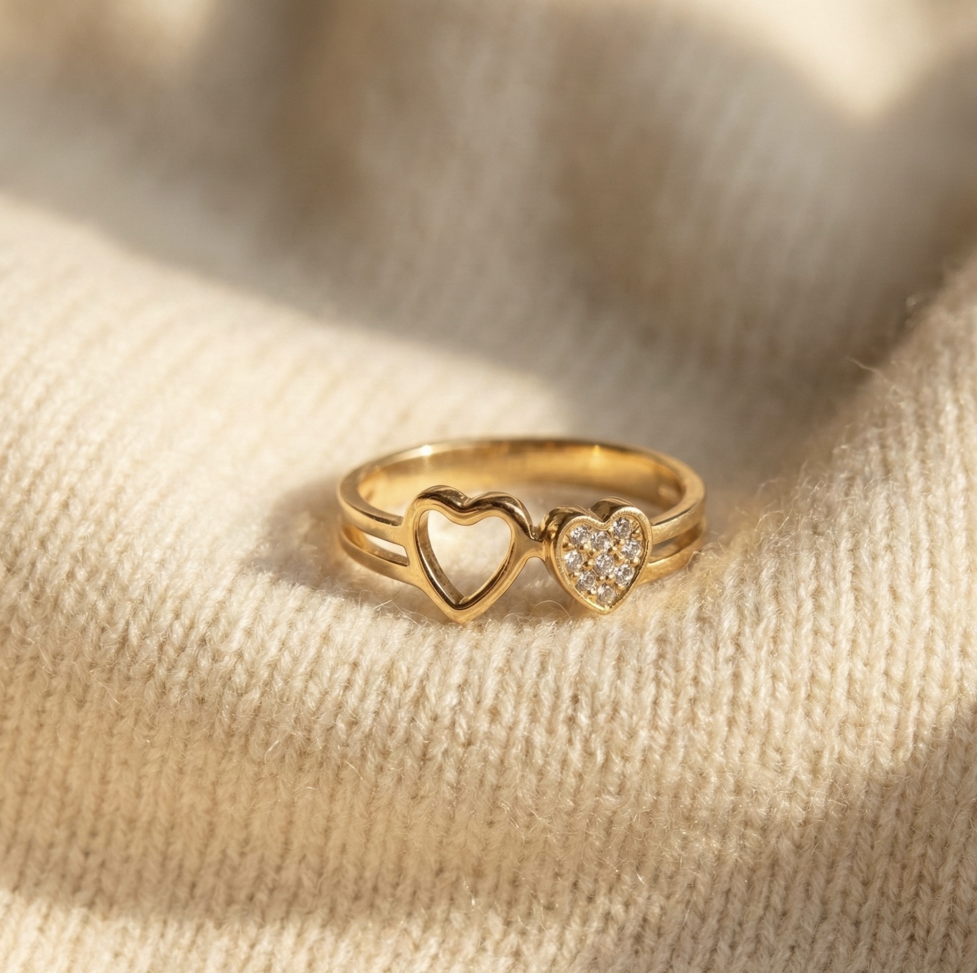 Featuring two side-by-side hearts, one minimal and one stone-studded, this ring blends warmth, meaning, and everyday luxury.